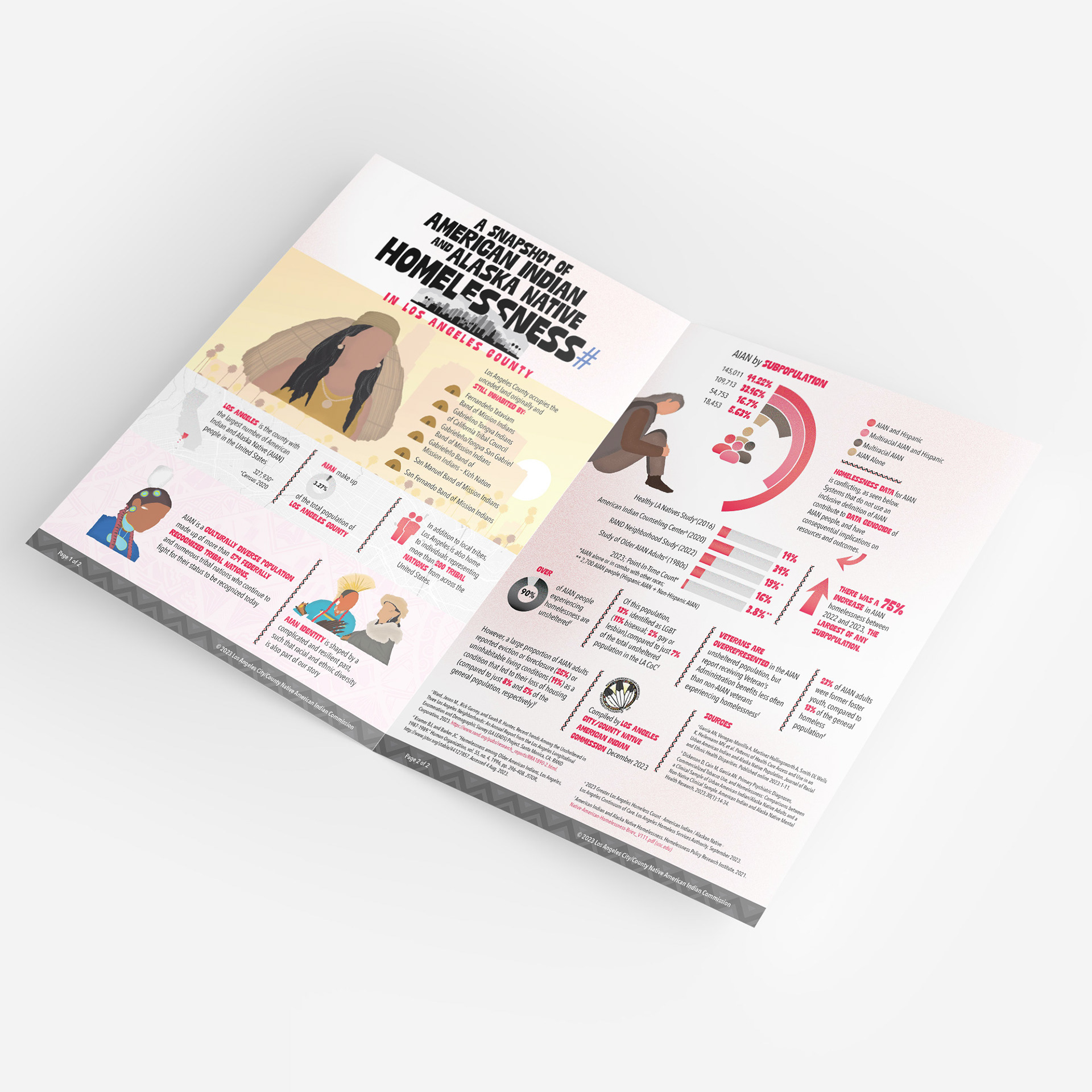 This project involved the design of an advocacy-focused data infographic for the Los Angeles City/County Native American Indian Commission (LANAIC), titled A Snapshot of American Indian and Alaska Native Homelessness. The infographic was released alongside a special data request produced by the Los Angeles Homeless Services Authority (LAHSA), highlighting gaps in how homelessness data is collected and represented for AIAN communities.