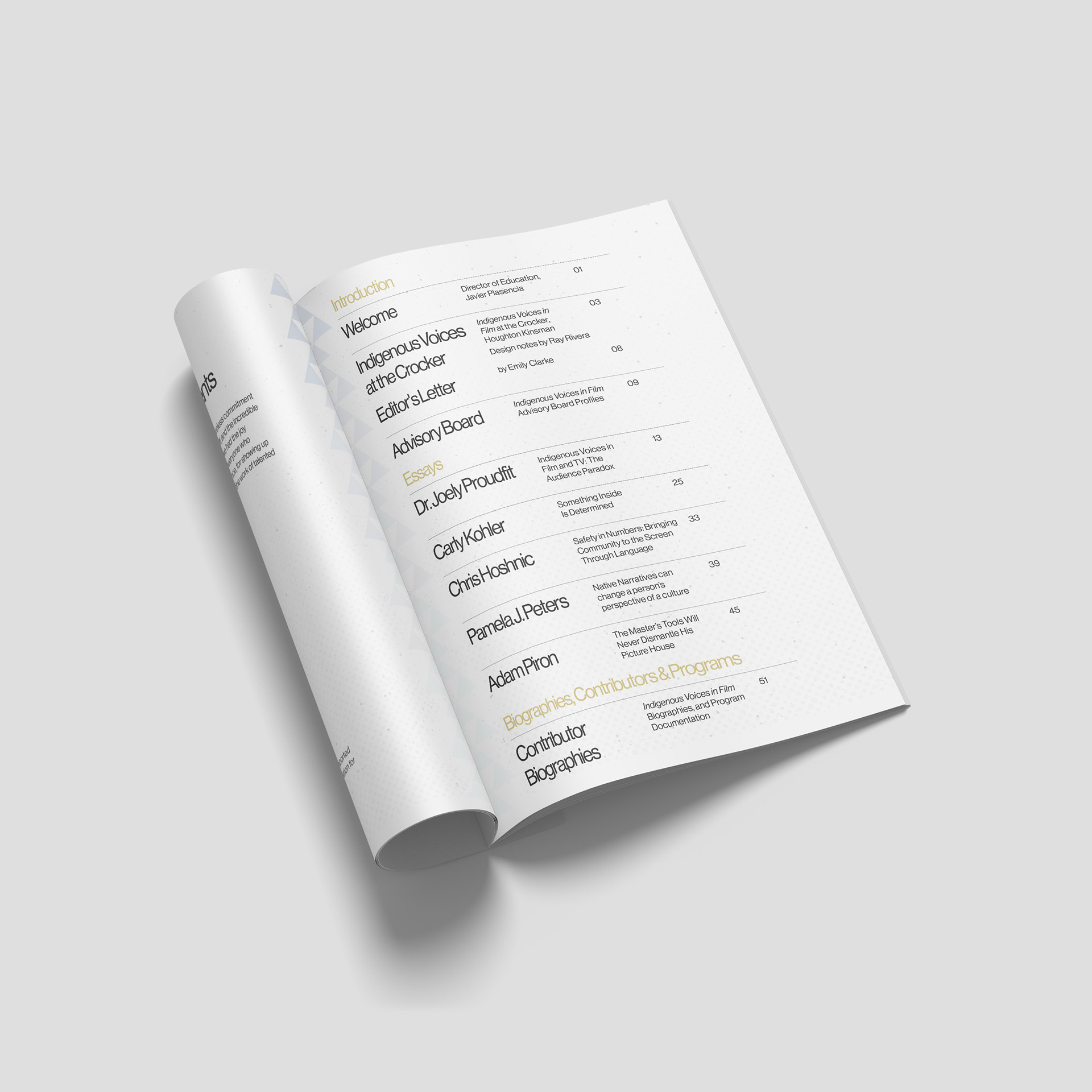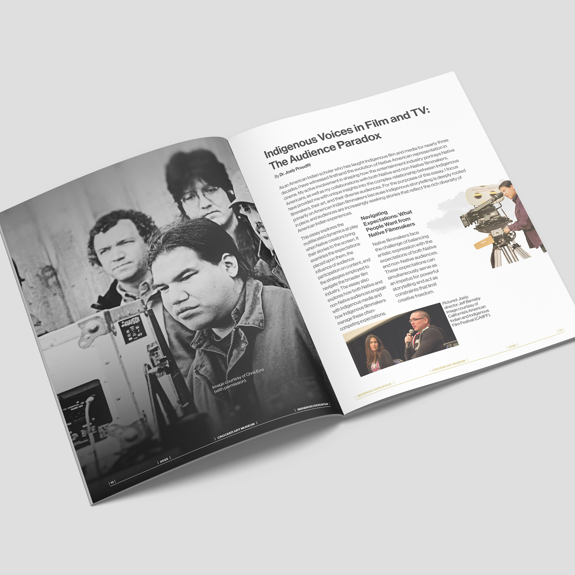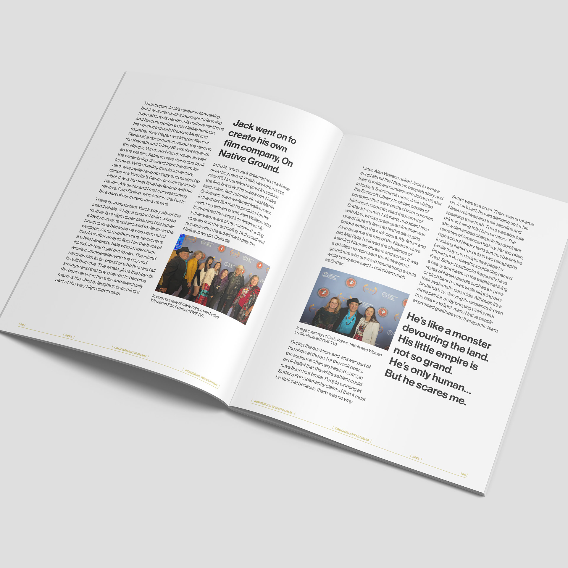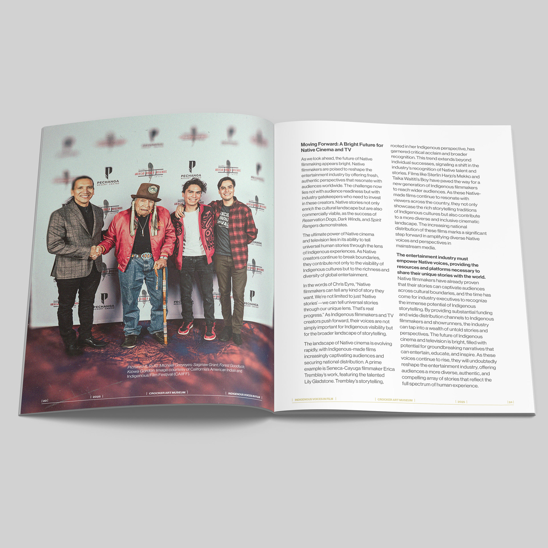 This project involved the design of Indigenous Voices in Film, a multi-page publication produced for the Crocker Art Museum in support of an ongoing program centered on Indigenous filmmaking, authorship, and creative labor. The publication accompanies a broader institutional initiative amplifying Indigenous voices in film and media through essays, interviews, advisory perspectives, and archival content.