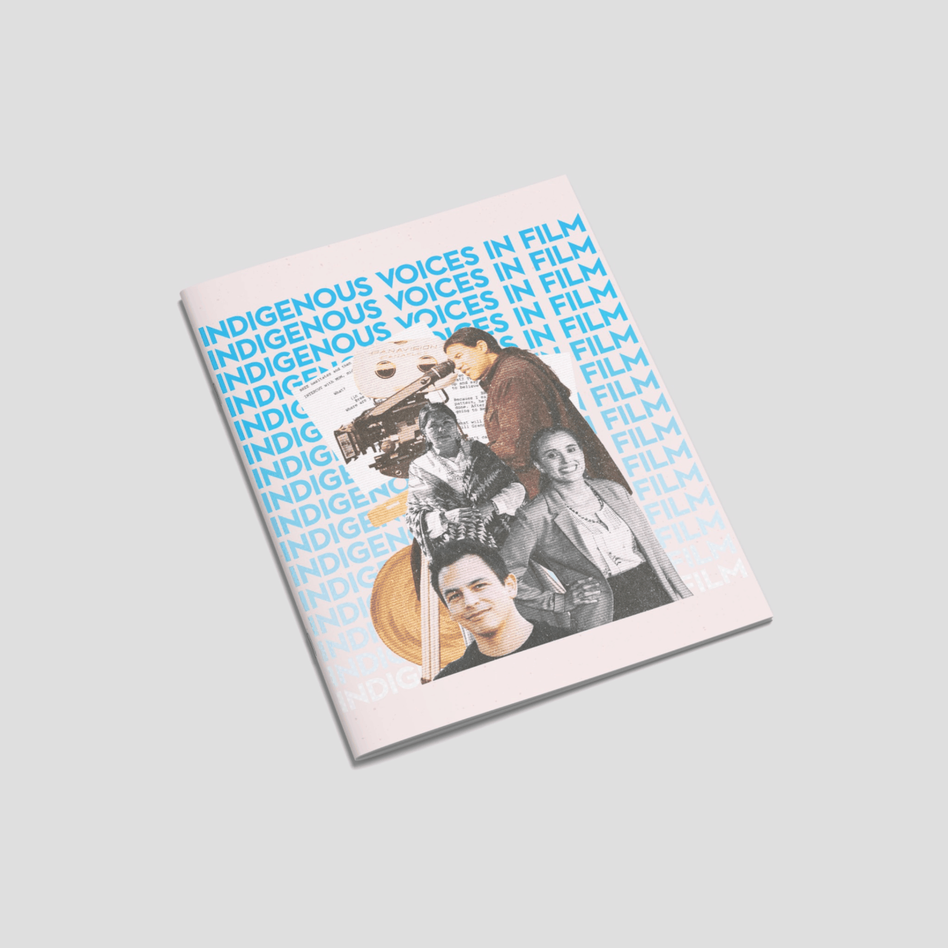 The design foregrounds process and authorship through layered imagery, halftone treatments, and collage-based compositions that reference filmmaking as a constructed, collaborative practice. Visual elements depicting film equipment, production environments, and portraiture position Indigenous creatives not as subjects of study, but as active authors and agents within the cinematic landscape.