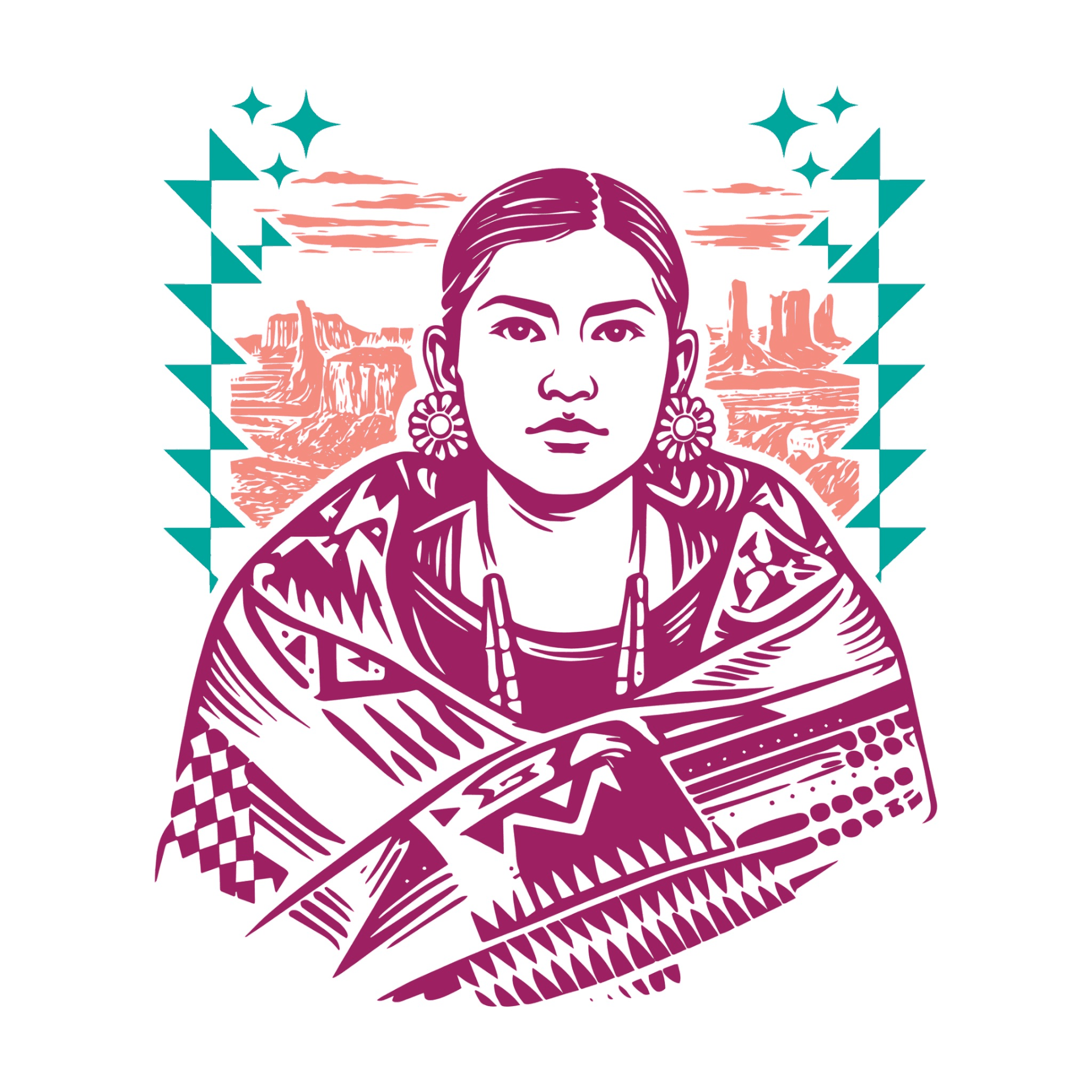 Executed in Adobe Photoshop and Illustrator, the illustrations reference traditional printmaking aesthetics—bold line work, limited color fields, and carved texture—while remaining digitally constructed. The compositions foreground Indigenous presence not as symbol, but as embodied authority. Landscape, adornment, and textile pattern operate as relational systems rather than decoration, reinforcing sovereignty as lived connection to land.