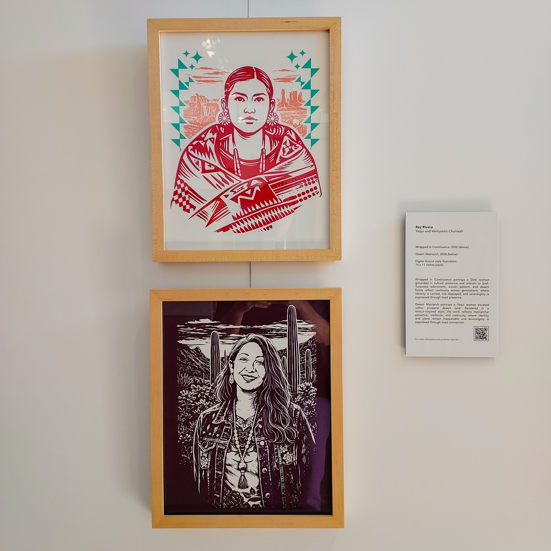 The series includes two digital linocut-style portraits, Desert Matriarch and Wrapped in Continuance, each centering Indigenous women grounded in land, continuity, and lived sovereignty. Drawing from both Sonoran desert and Diné visual language, the works emphasize matriarchal strength, relational identity, and cultural persistence across generations.